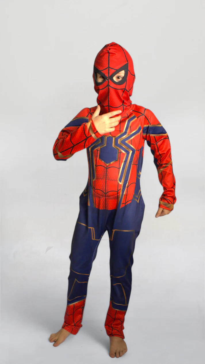 Disfraz Iron Spider para niños inspirado en Marvel. Incluye traje completo rojo con detalles dorados y azules. Perfecto para Halloween y fiestas temáticas.
